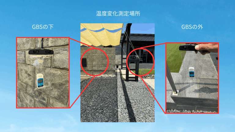 では何も遮るものがない駐車場などの炎天下の場所で、グランドビッグシェードを設置するとどのくらい違うのか、温度計を用いた調査があります。