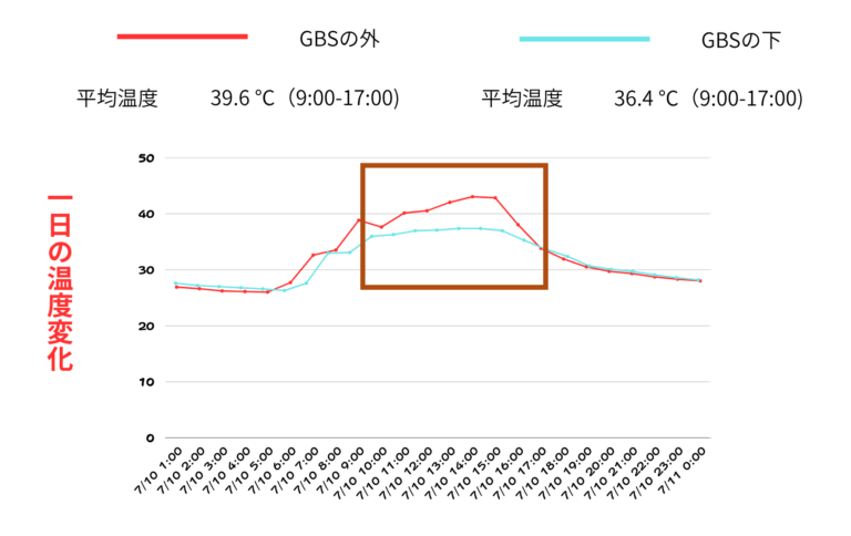 グランドビッグシェード下とグランドビッグシェード外の温度変化の違いを示したグラフを見ると、グランドビッグシェード設置により日中の温度上昇が抑えられていることが分かります。